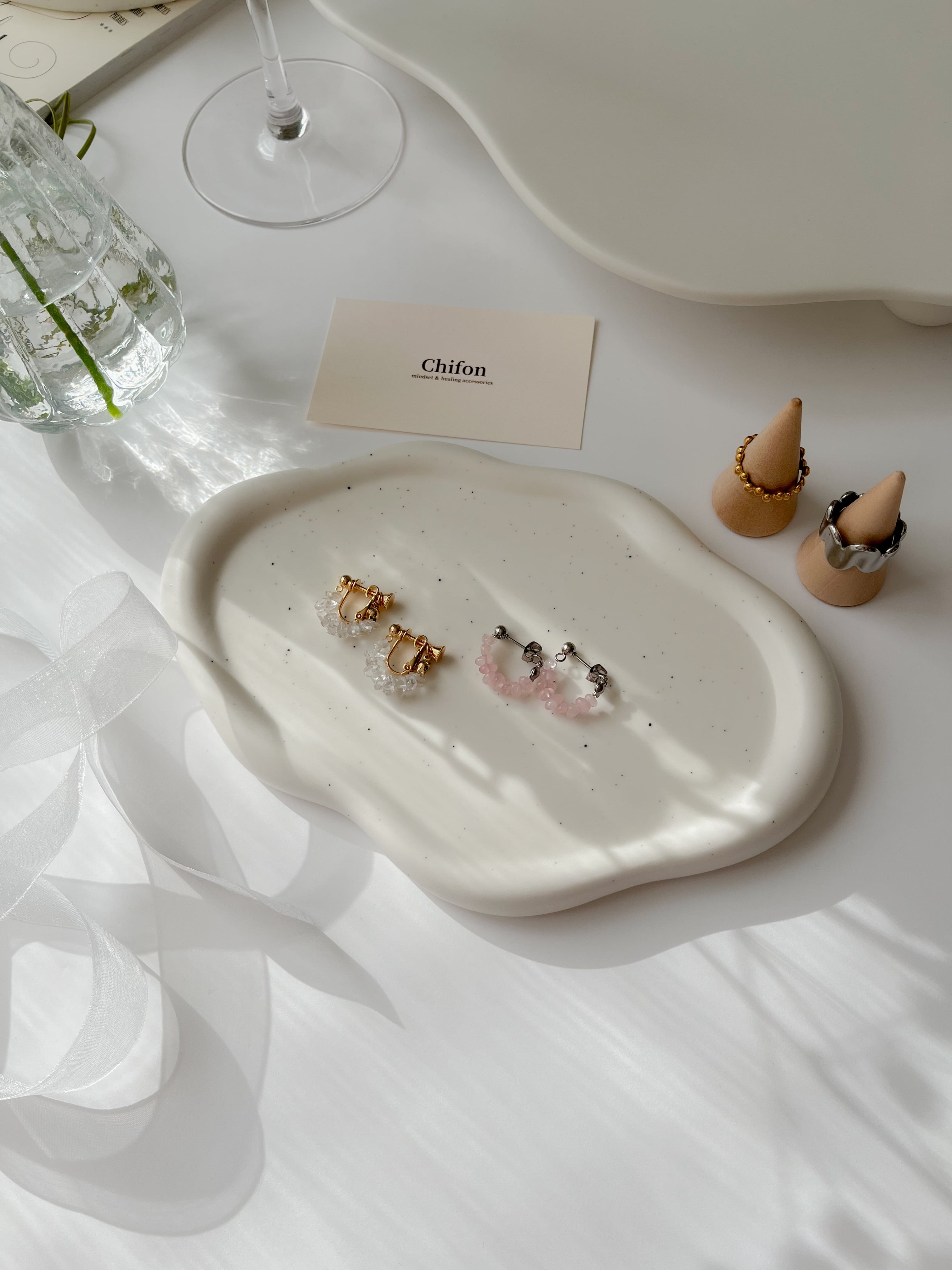クリアな輝きが心を整えてくれる、クリスタルの天然石を使用したピアス。 石言葉は、「浄化」「調和」「開運」です。 ミニマルなフープデザインが、顔まわりにほどよい華やかさをプラス。 軽やかな着け心地で、デイリーにも取り入れやすいピアスです。 ピアス/イヤリングパーツはサージカルステンレス製で、金属アレルギーがでにくく、サビや傷にも強いためお手入れも簡単です。 ◇個体差について 当商品は本物の天然石を使用しているため、一点一点形や大きさに少しの違いがございます。あなただけの特別な個性としてお楽しみいただければ幸いです。 サイズ:約17-20mm 下記【パーツ選択】より、 ◾️ピアス ◾️イヤリング からご希望のパーツをお選びください。 ◇アレルギー対応パーツについて◇ 当ショップでは、サージカルステンレス製のアレルギー対応パーツを使用しております。 素材はアレルギー性が非常に低く、医療用工具にも使用されていますので、敏感なお肌の方でも安心してご使用いただけます。※個人差があります。