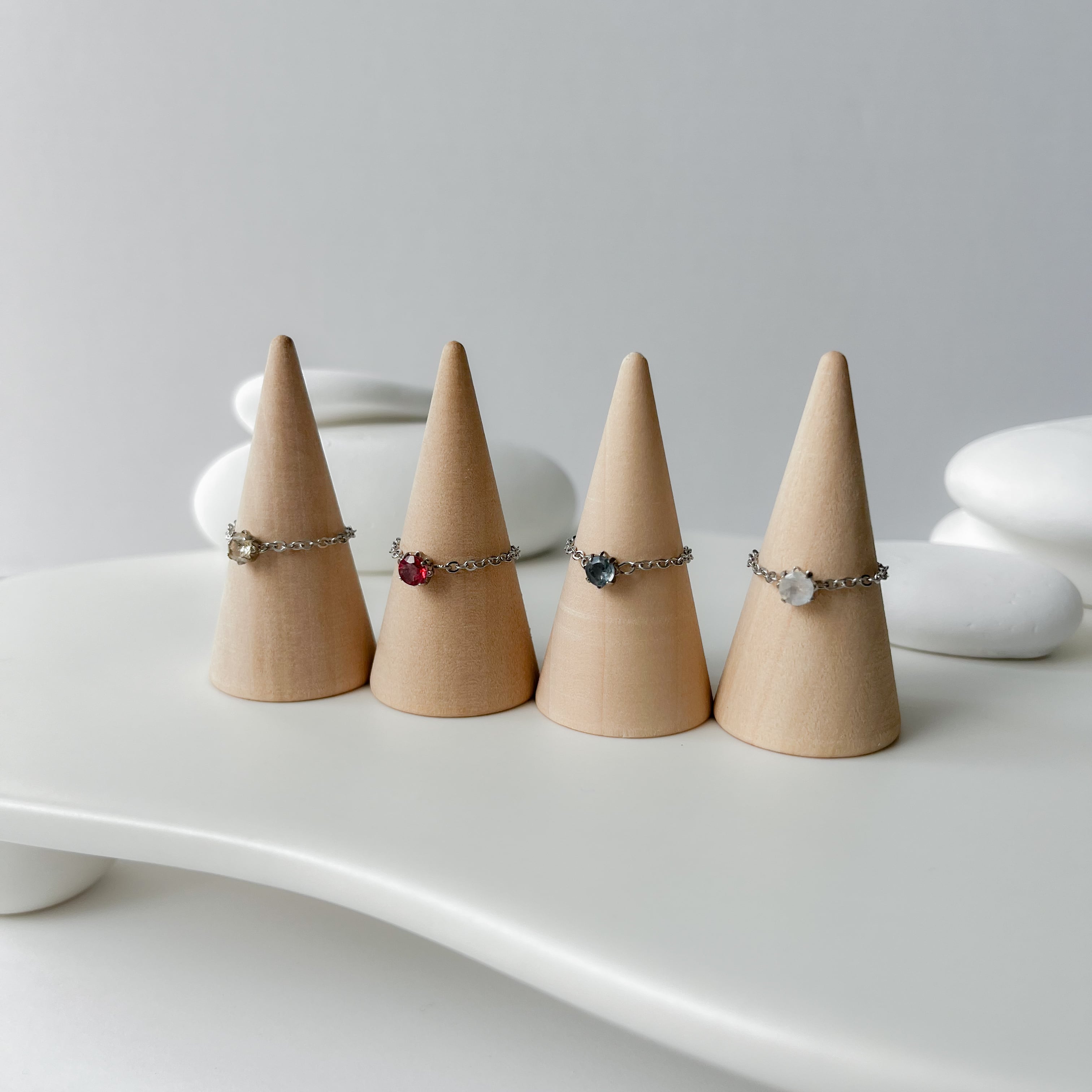 レインボームーンストーンの優しい輝きが魅力のチェーンリング。 華奢で繊細なシルエットが主張しすぎずに程よく手元を彩ってくれます。 レインボームーンストーンの石言葉は、 「ストレス緩和」「幸福」「ひらめき」「健康」です。 優しい雰囲気の中に神秘的な輝きがあり、身につける人の魅力を静かに引き立ててくれるパワーストーンです。 スライドボールでサイズを調整できるので、その日の気分に合わせた付け方をお楽しみいただけます。 天然石のカラーは4色展開で、それぞれチェーンの色をゴールドとシルバーからお選びいただけます。 ◇素材について 石座:真鍮 チェーン部分:14kgf スライドボール:サージカルステンレス チェーンとスライドボールには、変色や金属アレルギーが起きにくい高品質な素材を使用しています。 ただし、石座部分は真鍮のため、金属アレルギーをお持ちの方はご注意ください。 ストーンサイズ:約4mm チェーン幅:約1.3mm 下記よりチェーンの色をゴールドとシルバーからお選びください。