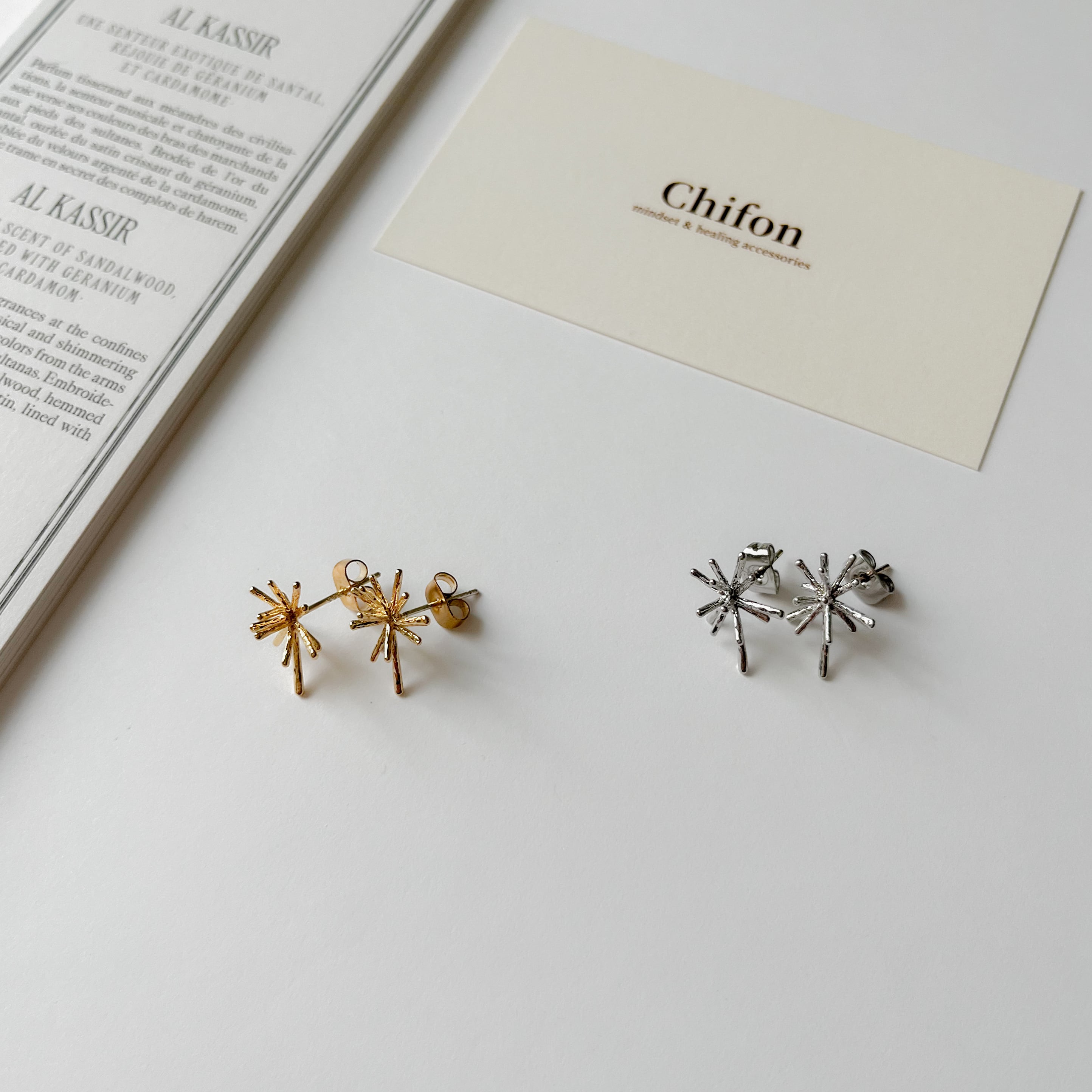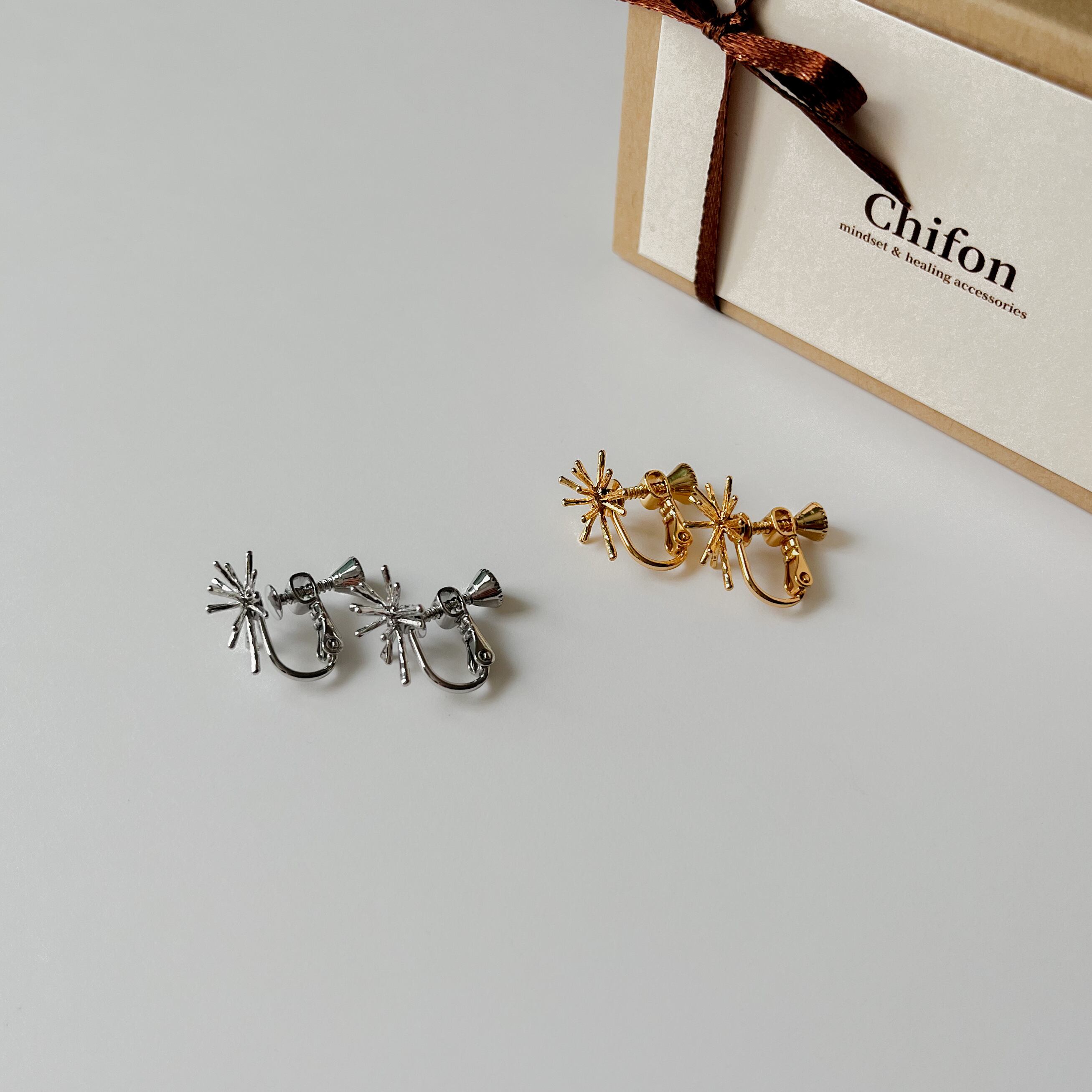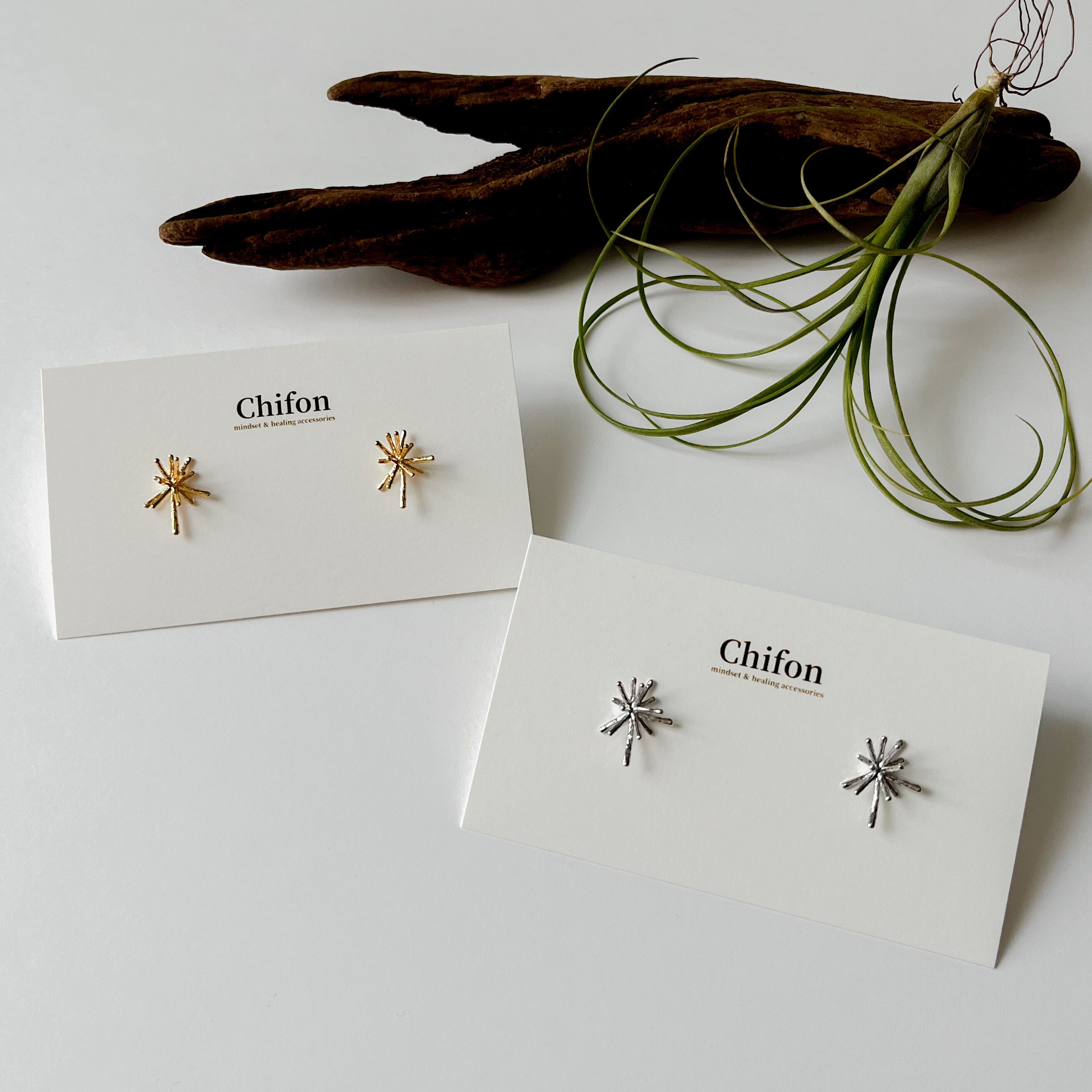 モチーフ部分とイヤリングパーツはニッケルフリー加工を施した真鍮製で、ピアスの芯部分はシルバー925が使用されています。